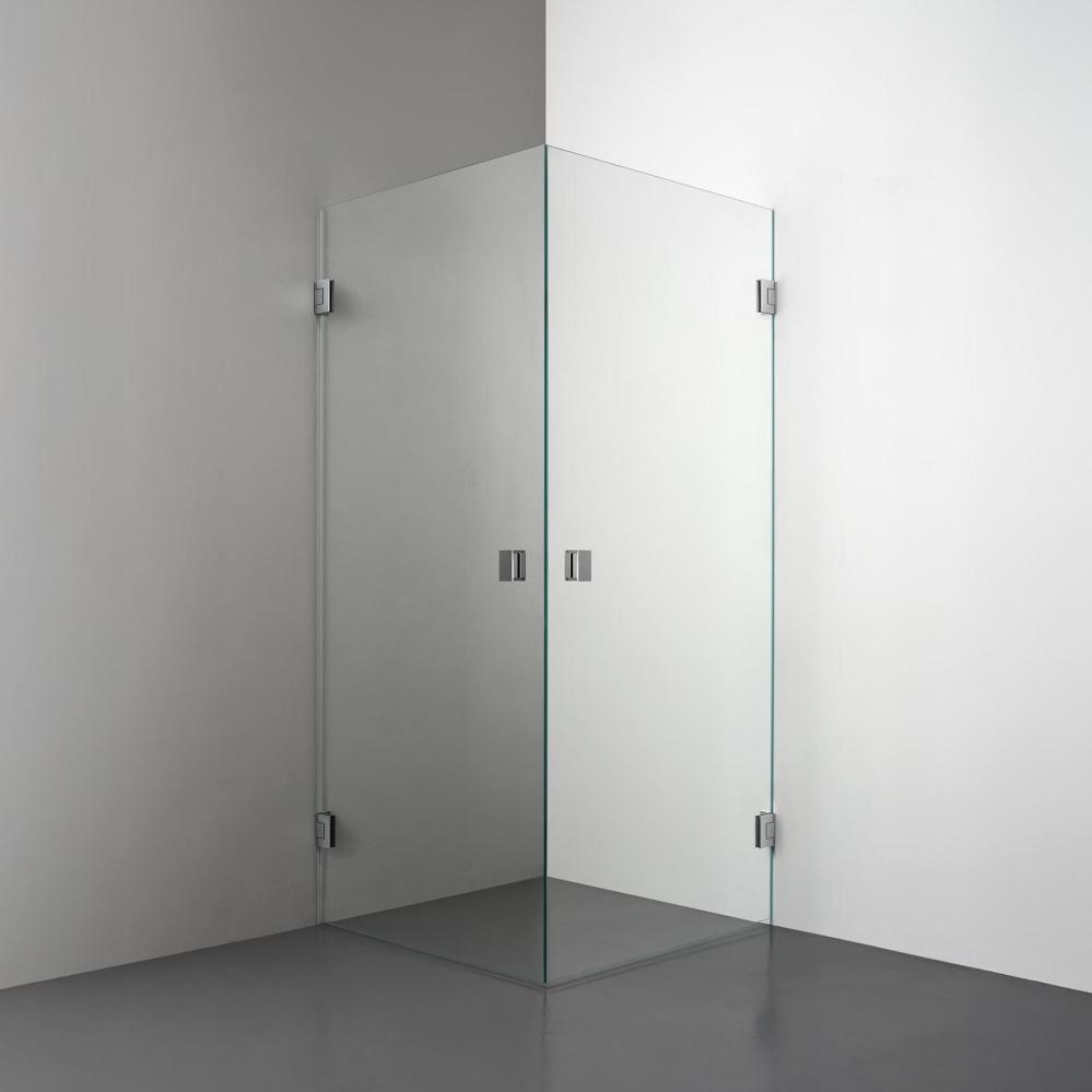 Den här modellen erbjuder två raka duschdörrar i 8 mm glas som möts i en hörna. Lösningen utstrålar lyx och modernitet - med möjlighet att välja mellan olika handtagsalternativ - vilket gör den till en stark kandidat för badrum som kräver en stor ingångsyta och en exklusiv design.