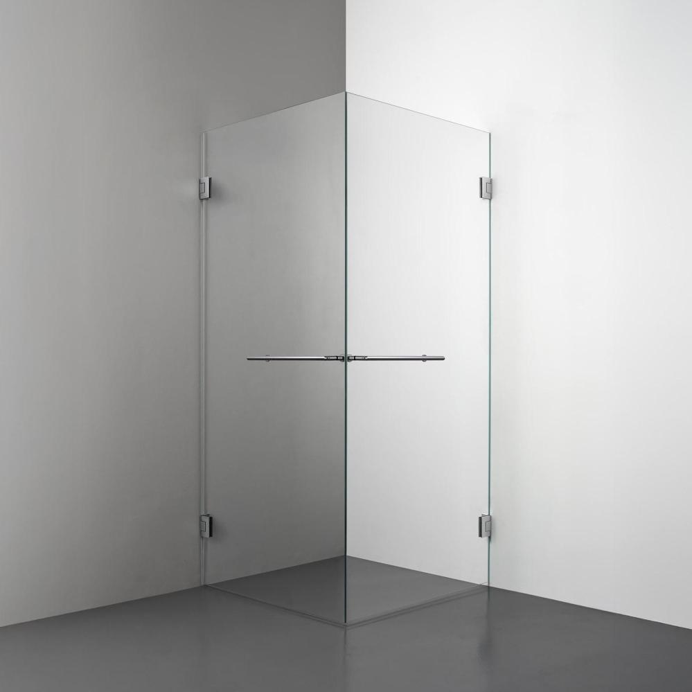 Den här modellen erbjuder två raka duschdörrar i 8 mm glas som möts i en hörna. Lösningen utstrålar lyx och modernitet - med möjlighet att välja mellan olika handtagsalternativ - vilket gör den till en stark kandidat för badrum som kräver en stor ingångsyta och en exklusiv design.