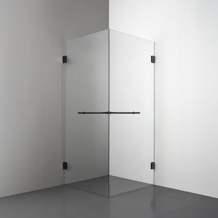 Den här modellen erbjuder två raka duschdörrar i 8 mm glas som möts i en hörna. Lösningen utstrålar lyx och modernitet - med möjlighet att välja mellan olika handtagsalternativ - vilket gör den till en stark kandidat för badrum som kräver en stor ingångsyta och en exklusiv design.