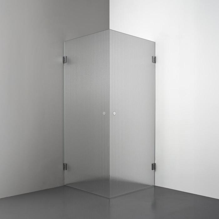 Den här modellen erbjuder två raka duschdörrar i 8 mm glas som möts i en hörna. Lösningen utstrålar lyx och modernitet - med möjlighet att välja mellan olika handtagsalternativ - vilket gör den till en stark kandidat för badrum som kräver en stor ingångsyta och en exklusiv design.