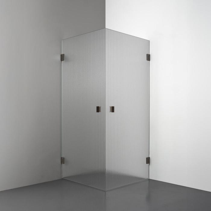 Den här modellen erbjuder två raka duschdörrar i 8 mm glas som möts i en hörna. Lösningen utstrålar lyx och modernitet - med möjlighet att välja mellan olika handtagsalternativ - vilket gör den till en stark kandidat för badrum som kräver en stor ingångsyta och en exklusiv design.