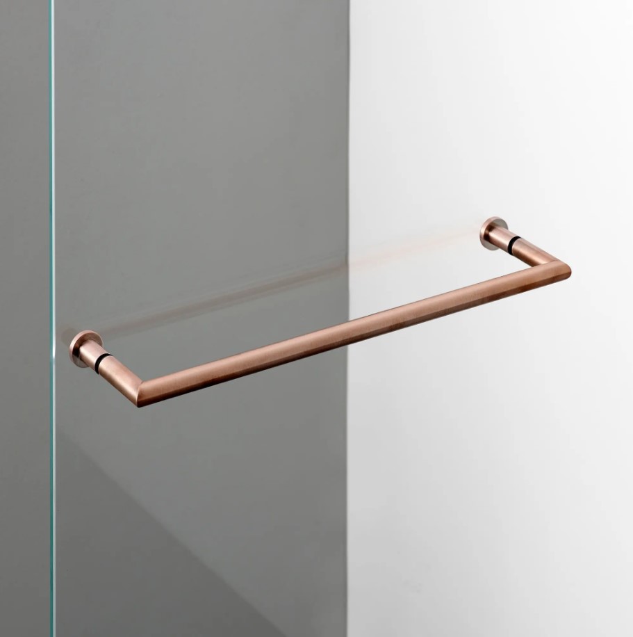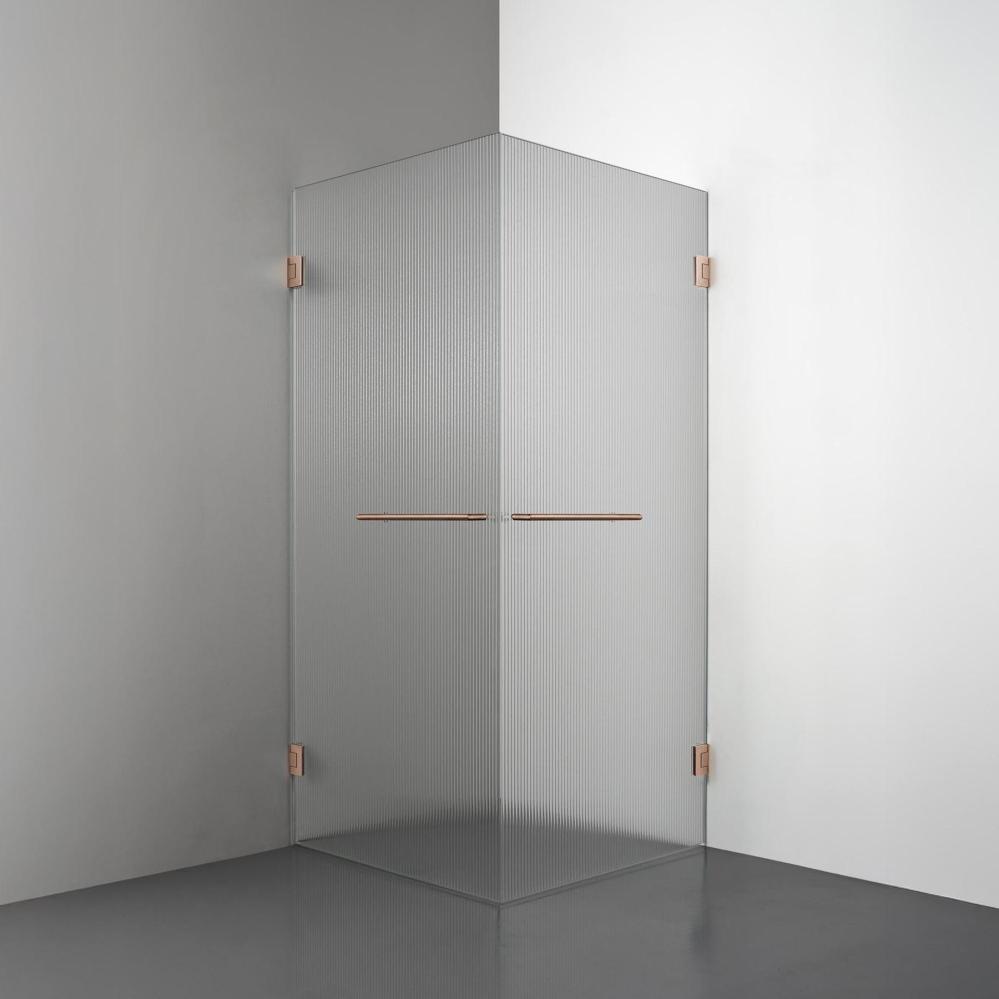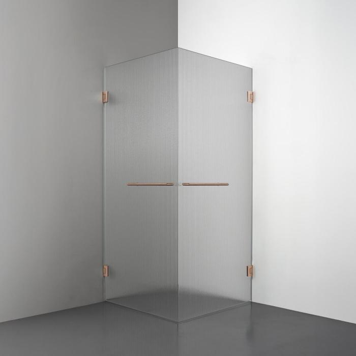Den här modellen erbjuder två raka duschdörrar i 8 mm glas som möts i en hörna. Lösningen utstrålar lyx och modernitet - med möjlighet att välja mellan olika handtagsalternativ - vilket gör den till en stark kandidat för badrum som kräver en stor ingångsyta och en exklusiv design.