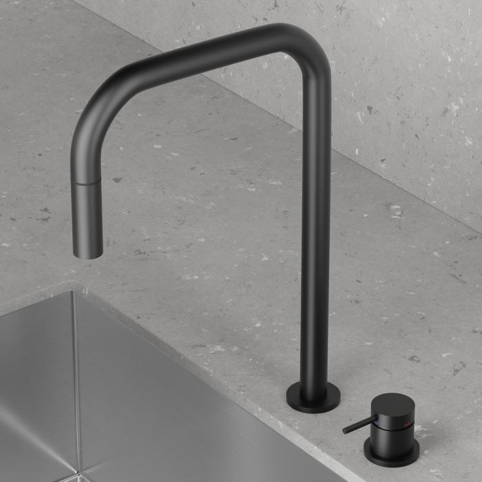 Blandare med separat pip och vred. Avskalad slim design där mjuka former och raka linjer samspelar och förhöjer. Avstånd och vinkel mellan handtag och pip kan anpassas efter personlig smak och behov. Formgiven med ett diskret utdragbart munstycke för smidig rengöring. Ett designelement med både subtil och utsökt närvaro.