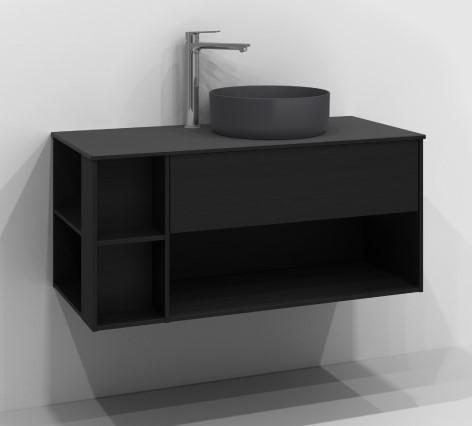 Svedbergs Epos Kommod 100x45 med ovanpåliggande tvättställ. Handfatets placering ger praktisk avställningsyta och du kan välja om du vill ha handfatet på höger eller vänster sida.