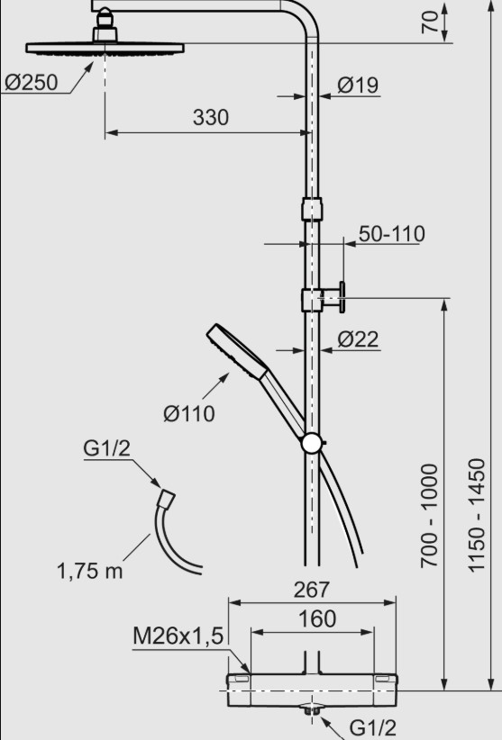 - Väggfäste fritt justerbart i höjdled, 700–1000 mm från anslutning och 50–110 mm utsprång från vägg, 2x20 mm distanser medföljer, med väggtätning, dold rörskarv.