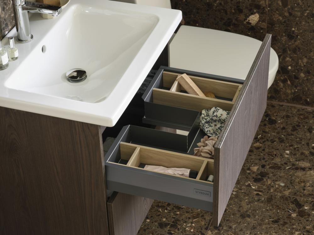 Kommod Free Compact 600 Lådor Maja vit. Kommod för centrerat tvättställ. Två lådor med dämpning. Gummimattor och lådindelning Mejram ingår.
